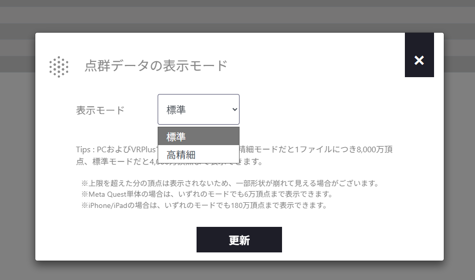 | -Detail | →現在デバイスの種類ごとに、快適に表示できるように最大頂点数が設定されます。 それを超える場合は上限値まで自動的にリダクションされて表示されるためこちらは操作不要です。 デバイスごと最大頂点数 iOS:180万まで Quest・HoloLens:60万まで PCおよびVRPlus:[標準モード]4000万頂点まで [高精細モード]8000万頂点まで ※切替方法は下記を参照ください。 |